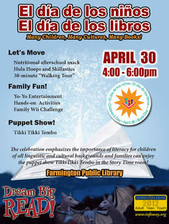 The annual Día celebration at the Farmington Public Library will kick off with registration for “Dream Big” summer reading! Día provides a wonderful opportunity for parents to promote the power of books and reading to their own children. Every day of the year can be “Día,” a day for linking all children and books!