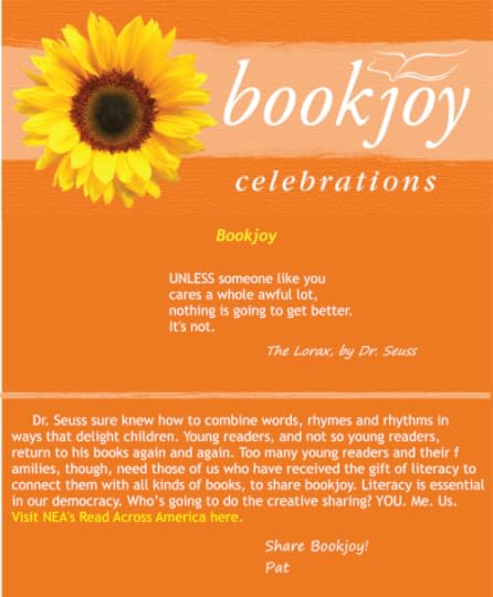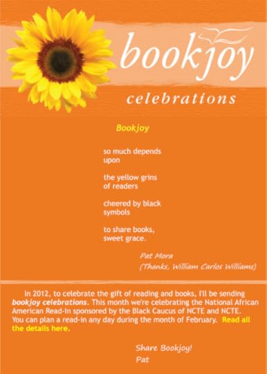 I welcome your collaboration. Send your favorite quotes about reading, books, poetry; brief original poems, a few lines from writing you love, visuals, ideas, etc. to bookjoyATpatmora.com . (We'll credit you, of course.)