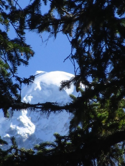 Tonight, the moon is high in the sky, nearly full, and shining brightly on the glaciers and recent snow.