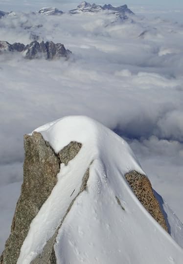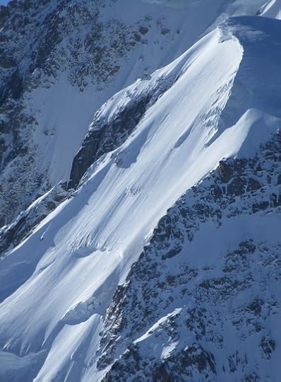 There is some mottled cloud passing over the mountain from time to time, subduing the moon's light, while the steep high ridge of spiky peaks is silhouetted darkly, menacing in the bright sky. ...