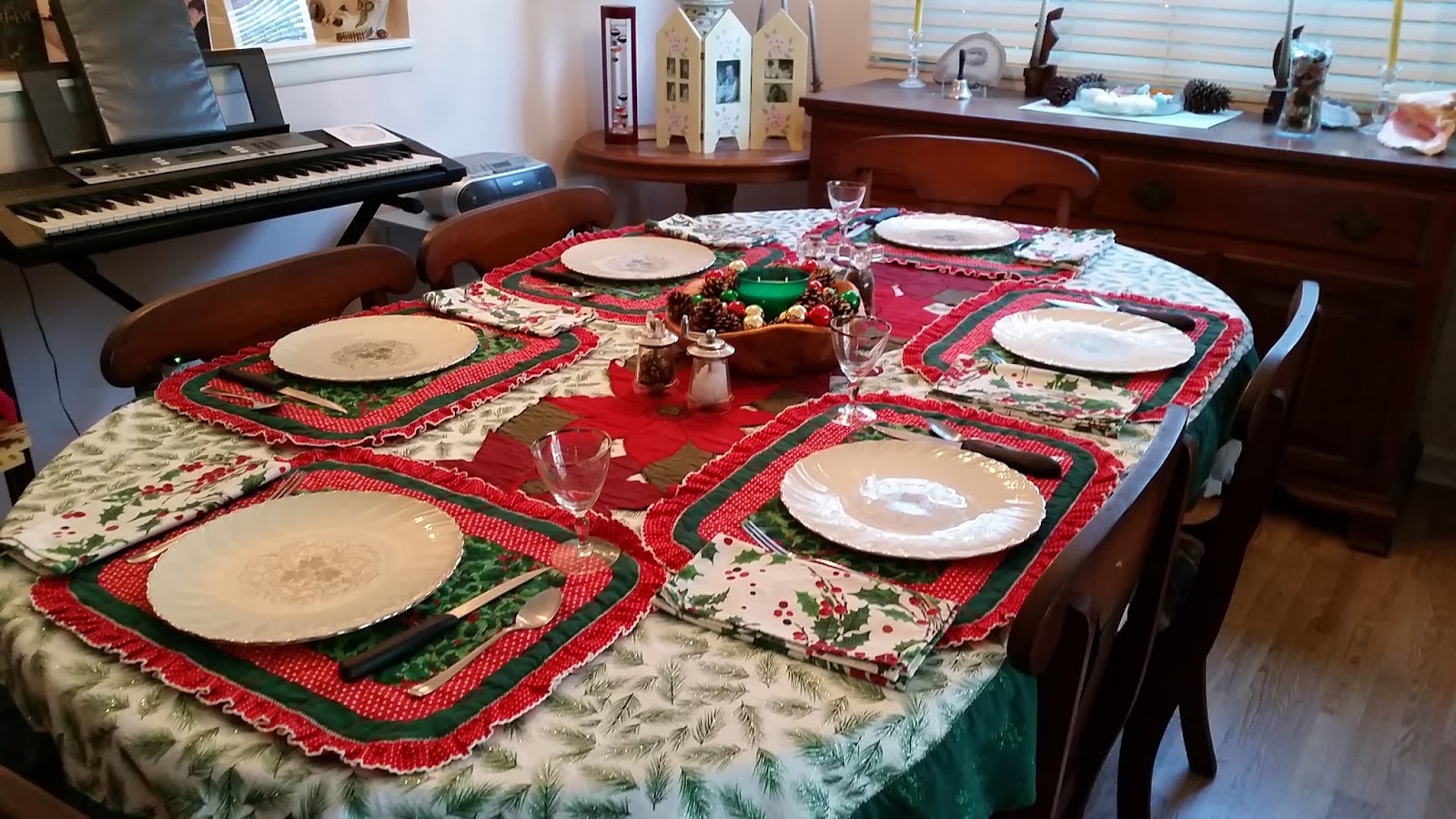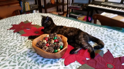 Fortunately, Squeak allowed the table to be set for Christmas dinner. No tromping on the plates or kicking over the wine glasses. Though the centerpiece has become fair game since we cleared the table.