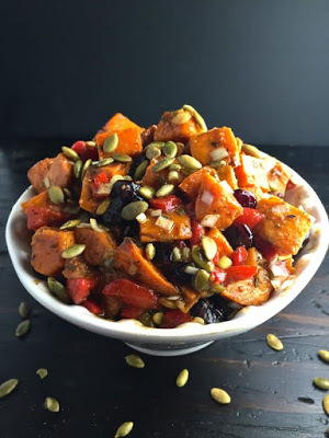Sweet Potato SaladThis is one of the most exotic tastes I have encountered among the many recipes I've collected. I prefer it served warm and with pine nuts in place of pumpkin seeds, but that does not affect the overall flavor impact, which is truly remarkable. This recipe is from Grits and Pinecones. Below is the original recipe for 8 servings. I halved it for my personal use.Grace note for Recipes One and Three: If you a serving only 1 or 2 persons and expect to have leftovers, do NOT mix the dressing with the salad ingredients. Save and use only when needed, so salad greens do not wilt nor the flavors become overbearing.