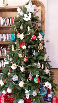 My modest tree - downsized when I moved to Longwood - but it's full of memories, from an ornament I made at age 10 to those made by my children when little. Items bought all over the U.S., including the Ringling Museum in Sarasota, plus islands in the Caribbean, Harrods in London, and Tralee, Ireland. Also, ornaments acquired from Amway to the Orlando Art Museum's Festival of Trees. There's everything from hand-blown glass to hand-crocheted snowflakes. Butterflies from Key West, birds from ? And garlands from Target. Altogether a fun tree, and this year my granddaughter Hailey took over from her mother as the person designated to help Gramma "put up the tree" and "get the lights plugged in all the right sockets." First time we ever got it right on the first try! (Thanks to a 14-yr-old's sharp eyes.)