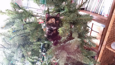 Last year I did not put up my Christmas tree - it remained bagged-up in my garage as my treasured box of ornaments could not be found in my son's warehouse, where we store our Christmas stuff. But, fortunately, he moved the contents of his warehouse to Longwood this year, and lo & behold, my lifetime collection of ornaments turned up. The night before this photo was taken, the pieces of the tree had just come out of two years of being bagged—the lights not connected, the branches all askew. But while I was reading the morning paper, it acquired its first ornament. (I have grave doubts about some of fragile ornaments when the tree is finally decorated. And yes, this is Squeak's first Christmas. She is snoozing in my lap as I type this.)