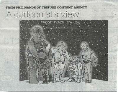 The "cartoon" below was also in Thursday's Orlando Sentinel. No explanation needed, except perhaps to say that it was drawn before Carrie Fisher's death was compounded by that of her mother, Debbie Reynolds.