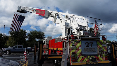 So here is the post that should have appeared late last Sunday after a very moving 9/11 Memorial in Oviedo, Florida. I was there because The Citrus Singers were performing two numbers, and my daughter, their director, was singing "Amazing Grace." The event started late, due to a sudden squall, which came back right in the middle of all the speeches. Susie sang from "under the canopy." I had brought an umbrella and was one of the few who didn't have to take shelter. And as I heard the Moderator, the Mayor, a Seminole County Commissioner, and our District 4 Representative speak - and watched memorials dedicated to the fallen policemen and firemen from Seminole County while the rain beat down and we remembered not only the 3000 who died in the towers but all the first responders who have died of diseased lungs since, I could only think, "God Wept." The gloom seemed fitting.