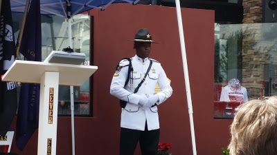 And here are three photos I took in spite of the rain. The soldier in the white coat stood even more stiffly than the guards at Buckingham Palace, but I notice he bowed his head while Susie sang "Amazing Grace." The entire event, by the way, was outside Rock & Brews in Oviedo, a franchise owned by the rock group Kiss.