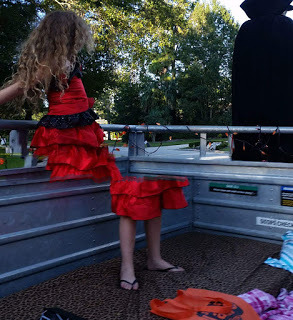 Cassidy, Halloween 2016If anyone can figure out how this photo happened, unintentionally, please don't hesitate to say!My daughter took the photo in the bed of the trailer 10-15 children were riding in for Trick or Treating in their neighborhood, where the houses are widely spaced. She thinks it has something to do with trying for a panorama, but it's WAY spooky. Particularly on Halloween night with what appears to be a cloaked figure lurking in the background. It reminds me of the time her father took a photo of Cassidy steering a tour boat in Boston Harbor, and she came out as a double image, something we didn't think possible on a cellphone photo. Hmmm.