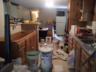 I paid little attention to my room in the middle of the night, except to take great care winding my way through the narrow corridor to my bed. But while huddling in there the next day, editing a manuscript, while our three guys tiled and laid floorboards so diligently there was no place to walk, I made a list of the contents of the room: an ugly utilitarian desk with high top, obviously salvaged from the original furnishings. But it was mostly hidden behind an anonymous 4 x 6 wood panel the men dragged in just before starting the floors. In a corner by the desk: numerous 10-foot strips of white molding, five fish poles (with a good-size fish net on top of the desk extension). Also in front of the desk was a huge cardboard carton (30x30x30?), which was supposed to contain pillows but was later discovered to be full of assorted comforters and blankets. (Note: I'm just getting started! )