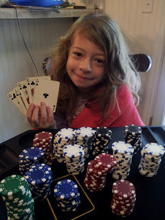 Kitchen by Sunday afternoon Now that we had a full floor, genuine wood dining table and six chairs, plus a just-hung chandelier, we had our first meal in the hideaway. Hamburgers grilled on the screenless screen porch (which also contained mountains of timber and a skill saw). With the addition of chips, salad & dressing from the groceries we bought in town, we dined in what seemed like true splendor after all the chaos.We even found some time to play. I thought to help the six-year-old play poker but when I advised folding, she returned a resounding "No!" And won. On the family's next visit, however, the nine-year-old beat everyone with a Royal Flush, as can be seen below.