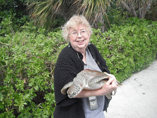 Cold in Tampa when we left, but after a day and a night cruising south (through rough seas), the weather in the Caymans was grand. Did a fabulous tour on the "Nautilus," a boat with the passenger seats below the waterline so we could see coral reefs, multitudes of colorful fish, and two shipwrecks (19th c.) Then off to a Turtle Farm - see photo below of me juggling a turtle. Note for those who have cruised the Bahamas: money from the 500 banks in the Caymans definitely affects the economy. The whole of Grand Cayman