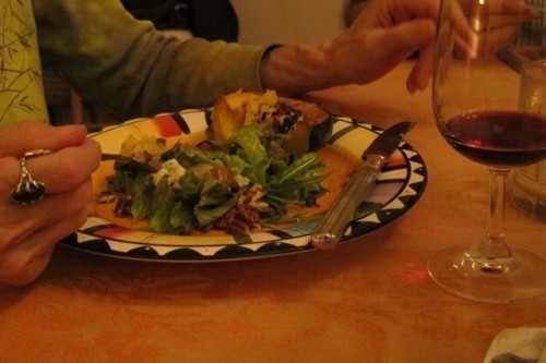 Vegetable Terrine (by Diane Cecily from a crazy-hard Martha Stewart recipe); Cheese Tray (by Diane Cecily with a gorgeous hunk of aged Pecorino brought by Hilary Masters); Roasted Pear-Bleu Cheese-Pecan Salad with Cranberry Vinaigrette; Slaughtered Nut Stew; Stuffed Acorn Squash; Cornbread; Roasted Pear Chutney; Pear Cake; Bittersweet Chocolate Tart with a Brown Sugar Crust; Bourbon Brambles (Shaken by Rick Schweikert); Wine; Beer; Vodka; Champagne.