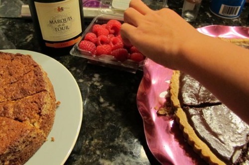 And then dessert: pear cake and bittersweet chocolate tart…with raspberries and champagne for all.