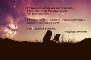 Jacquelyn Strickland, LPC, is a sensitive extravert (ENFP) who has a very well developed introvert side which she thoroughly enjoys and needs. She has been married to a non-HSP introvert (ISTP) since 1978, and is the mother two grown introvert sons, one of whom is an HSP, and the other who is quite kind and thoughtful, though does not possess an inherited, more finely tuned nervous system. She is almost certain her eldest granddaughter, born in 2014, is a sensitive extrovert. She explains this more thoroughly in the chapter on sensitive extroversion in her book on empowerment and the highly sensitive person ~ the book that, despite her resistance, has been writing itself.