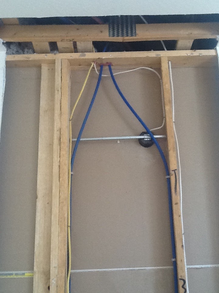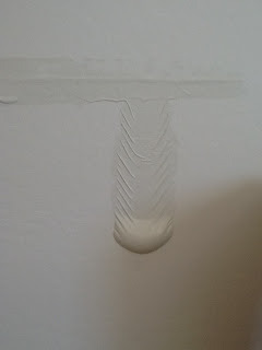 That's a pocket of water inside the wall, traveling...well, down my wall. There was a leak in the ceiling which my builder spent all day attending to. (And thus distracting me from choosing a Hop Winner!) By the end of the day, the wall in the bedroom looked like this: