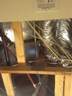 In addition to these lovely holes in my brand new house, there are three very large fans running day and night drying out the wet spots before the builder comes back and patches up these looming gaps.