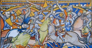 Chaos like in the picture above was the order of the day in the medieval mêlée. Only you weren't supposed to stab anyone's eye out, so that one knight there is being very bad. Although accidents did happen and some knights were killed, that was never the goal. You wanted to capture your opponent and hold him for ransom. Tournaments were intended to be practice for real battle, when stabbing opponents' eyes out would have been perfectly legal.