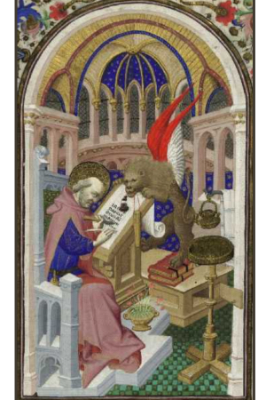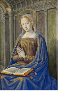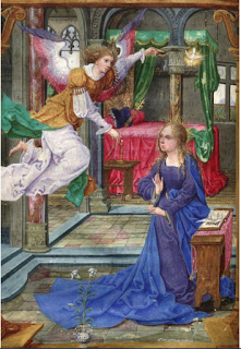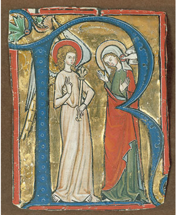 Luke 1:38 And Mary said, Behold the handmaid of the Lord; be it unto me according to thy word. And the angel departed from her. (Note how the artist painted Mary and the Angel inside the letter R.)