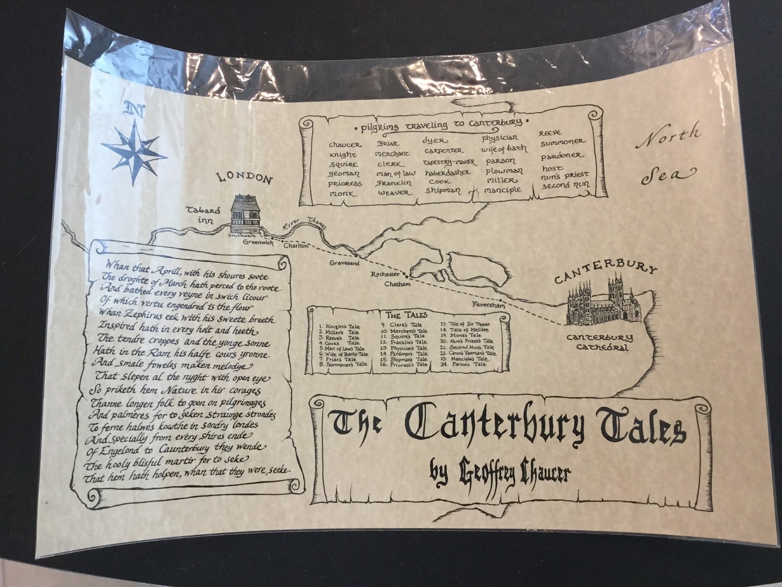 Prize 1 is a two-pack prize: an illustrated copy of Chaucer's Canterbury Tales plus a replica of a hand-drawn map of the pilgrims' route to Canterbury, which I picked up at this year's Arizona Renaissance Festival.