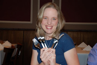 Today's Getting to Know You interview is with book reviewer Kathy Habel, AKA Inspired Kathy at I Am a Reader, Not a Writer. Kathy is shy. You'll notice that there are no photos of her on her blog, but I managed to sneak one of her setting the table for dinner. (Just kidding. I don't really know why she's holding all those forks. Maybe she'll share the full fork story with us someday!)Kathy has generously offered to hold a book giveaway in connection with this interview. If you'd like to win a copy of Beneath a Honeysuckle Vine by Marcia Lynn McClure, just leave a comment below AND INCLUDE YOUR EMAIL ADDRESS. Deadline to enter is midnight PST, February 16. The winner will be drawn by Random.org. USA entries only.