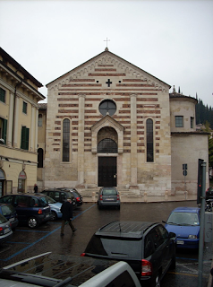 I recently went back in time to study some "striped" churches in medieval Italy. The stripes are horizontal and created by alternating light and dark colored bricks or stones. Here's one from around 1120, in Verona.