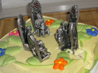 Happy Norman Conquest Day! This year, Duke Wiliam (the standing knight, soon to be King William) is holding a council of war atop my cake, planning his invasion of England. (And yes, I know the armor and hair styles are all wrong for 1066. These knights are "representative", okay? Someday I'll track down some more authentic looking Norman and Saxon knights to put on my yearly cake!)