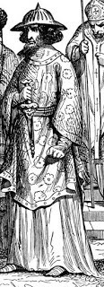 Here is a man wearing a long tunic, with a shorter, decorated surcote over it.