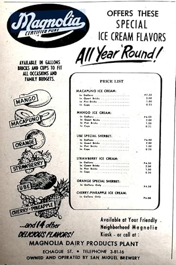 This Magnolia Ice Cream advertisement from 70 years ago was amazing not just for the prices, six pesos a gallon! They had a wider variety of flavors then, 20 different kinds, including unusual combinations like Ube sherbet not ice cream. Cherry-Pineapple too!