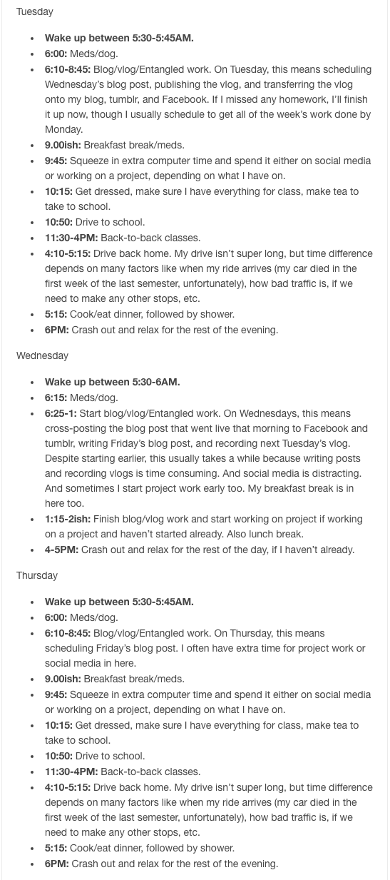 As I wrote up my schedule though, there were frequently times when I had to go back and add things because I'd forgotten I also did x and y and don't forget z. It was kind of a good exercise for me, if only because I realized I was busier than I imagined—which made me feel a little better about falling behind on things and/or being tired.