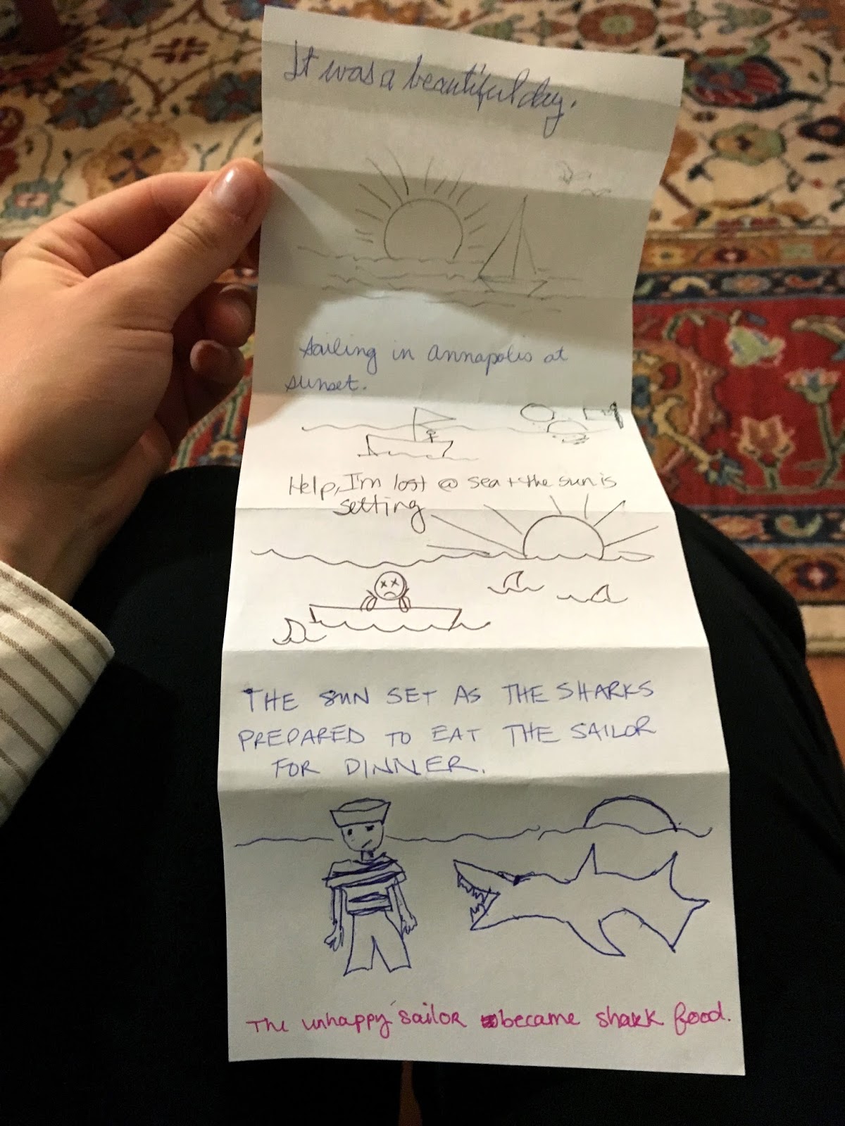 Friday morning, Kathy and I headed to Mercy High School where we talked to a lovely Creative Writing class about our publishing journeys and a bit about our books. The class was super interactive and asked us great questions and half a second after we took a class selfie the fire alarm went off, so Kathy and I made our sneaky escape. From there we drove over to the SCBWI conference center where we ate dinner and participated in fun ice breakers that involved writing a sentence, then drawing it, then folding it up and letting someone else translate the picture into words, etc., and ended up with hilarious results like this.
