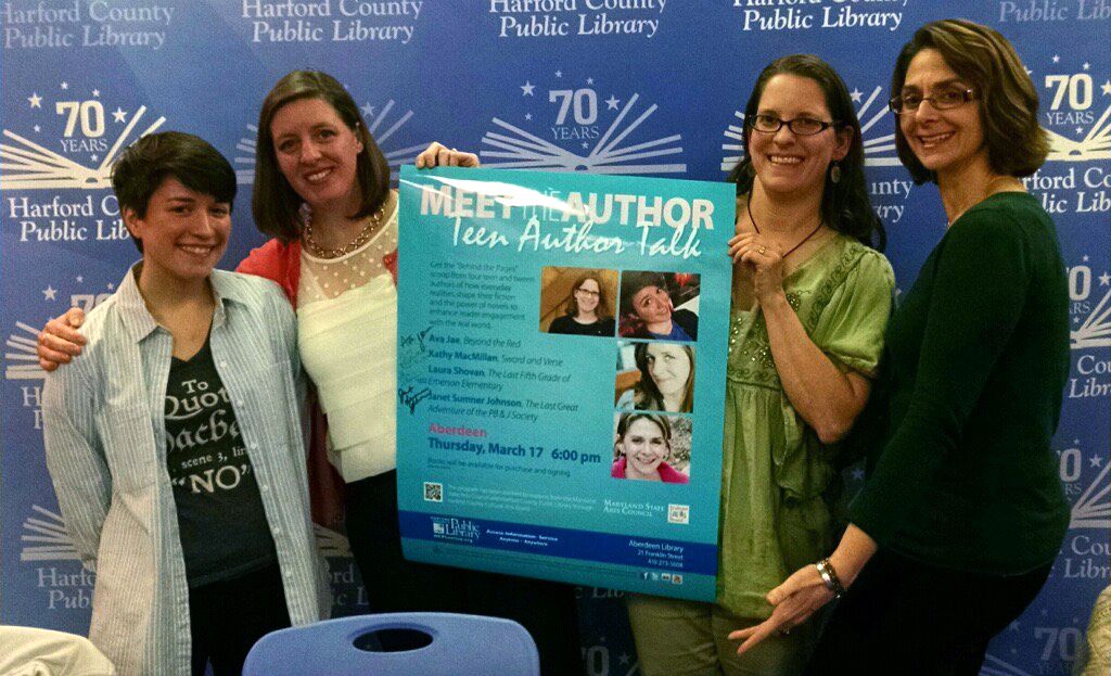On Wednesday, March 16th I donned my "I solemnly swear I'm up to no good" t-shirt and a blazer and flew over to Maryland! There I met up with Laura Shovan ( The Last Fifth Grade of Emerson Elementary ), Janet Sumner Johnson ( The Last Great Adventure of the PB&J Society ), and Kathy Macmillan ( Sword and Verse ) and we headed off to the C Burr Artz Library in Frederick, Maryland where we had our very first panel. It was super fun, and we answered questions and signed books, had dinner, and I crashed at Kathy's, who was graciously hosting me.