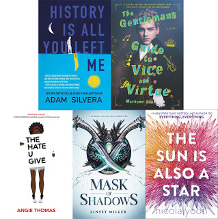 History is All You Left Me by Adam Silvera for the beautifully heartbreaking feels. The Gentleman's Guide to Vice and Virtue by Mackenzie Lee for the outrageous laughs and warm fuzzies. The Hate U Give by Angie Thomas for the brilliance that absolutely lives up to the hype. The Sun is Also a Star by Nicola Yoon for the really unique and beautifully done far-reaching story. Mask of Shadows by Linsey Miller for an awesome genderfluid assassin fantasy story that works.