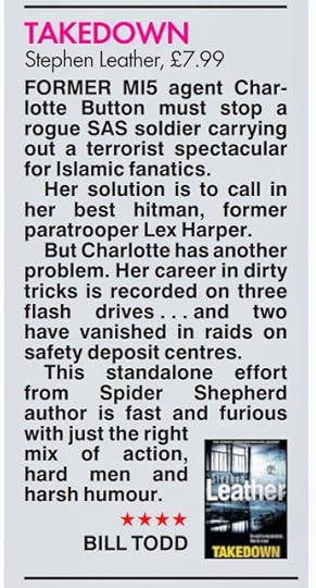 Earlier this year Hodder and Stoughton published another standalone thriller of mine, TAKEDOWN, featuring Lex Harper, a character from my Spider books..