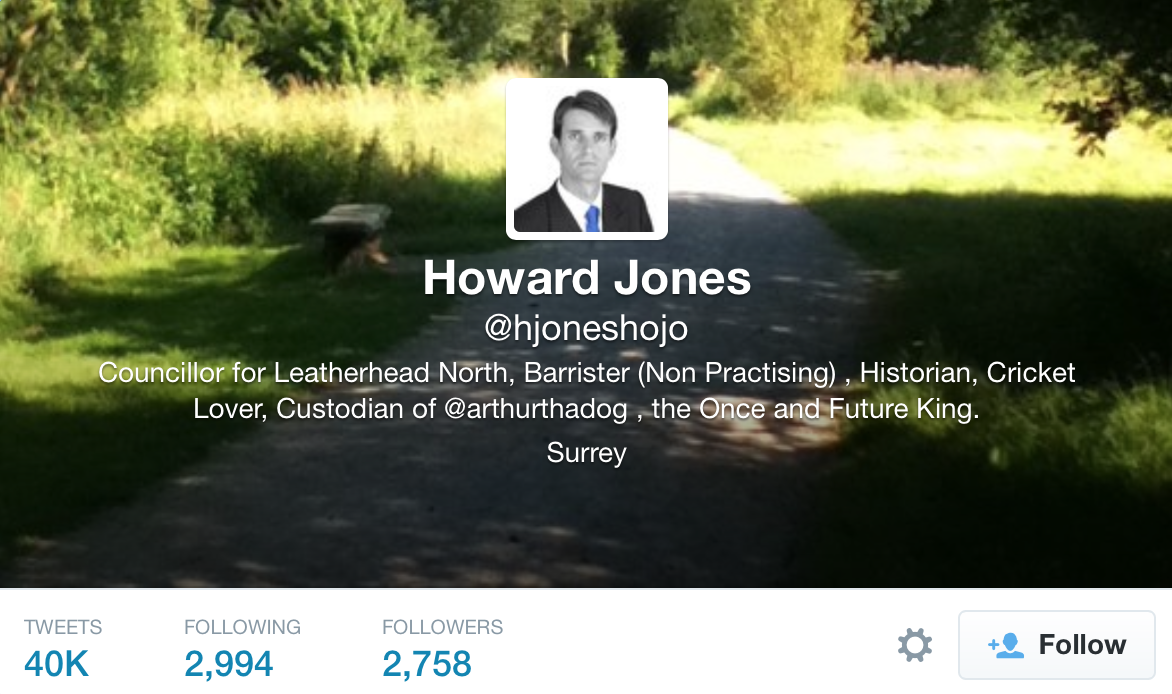 Howard Jones was recently elected as a Conservative Councillor for Leatherhead North - and yes, I appreciate the irony that my name plays such a large part in his life. He changed his Twitter profile to let the world know of his new political office. He removed the word 'politician' and added 'Councillor For Leatherhead North'.