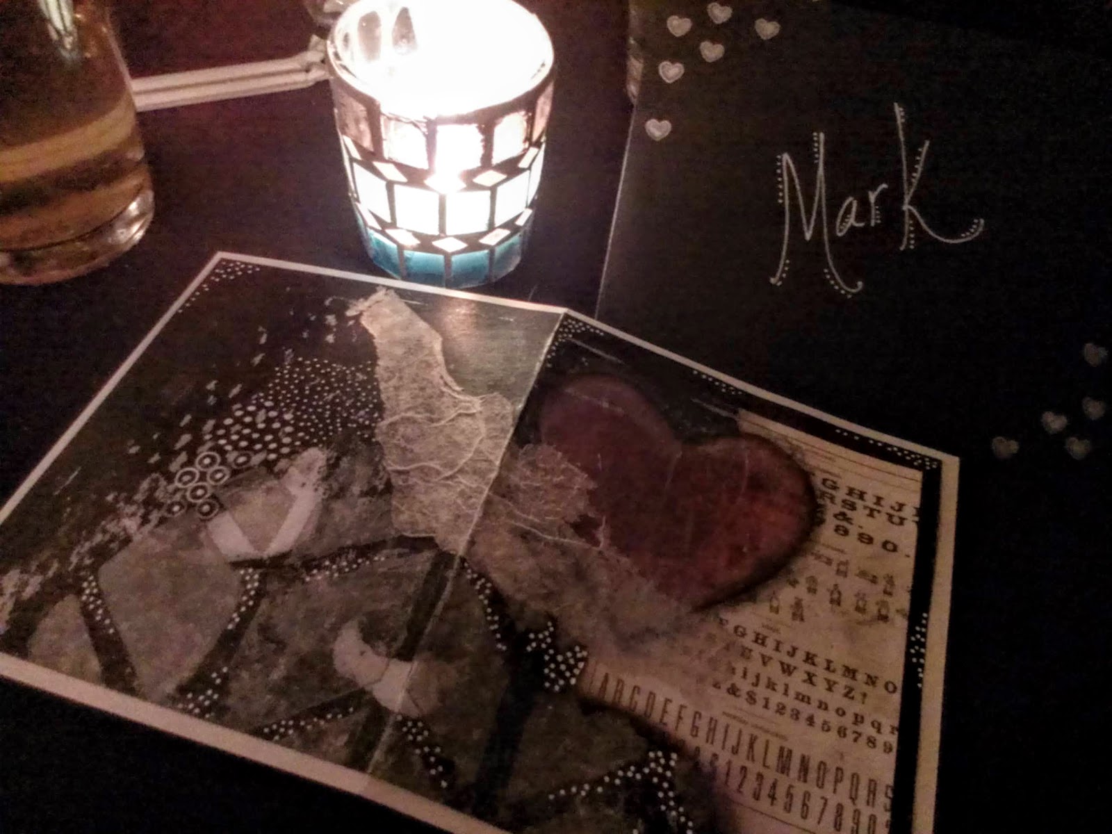 Kimberly and I had our celebratory Valentine's dinner on Friday night, which was fortunate, since, at the moment, the weather has taken a rather icy turn. This was my weekend to go to Martinsville to help Mum, so Friday, on our way up, we had a fine, fine dinner at The Celtic Fringe in Reidsville, one of our favorite bistros in the area. Why, of course there was a cache to grab on the way; in fact, there we ran into our local caching legend, Mr. Tom "Night-hawk" Kidd himself. For Valentine's Day, Ms. B. presented me with one of her custom, handmade cards, which she enjoys creating (see above), along with a very cool cast iron bat — the critter, not the club — to hang on my wall. (Apparently, her dad picked it out and told her, "This is Mark." Nice one, Delmar.) After dinner, we headed on to Mom's, and after taking care of some business affairs, Kimberly and I settled in to enjoy a bit more wine and a few episodes of