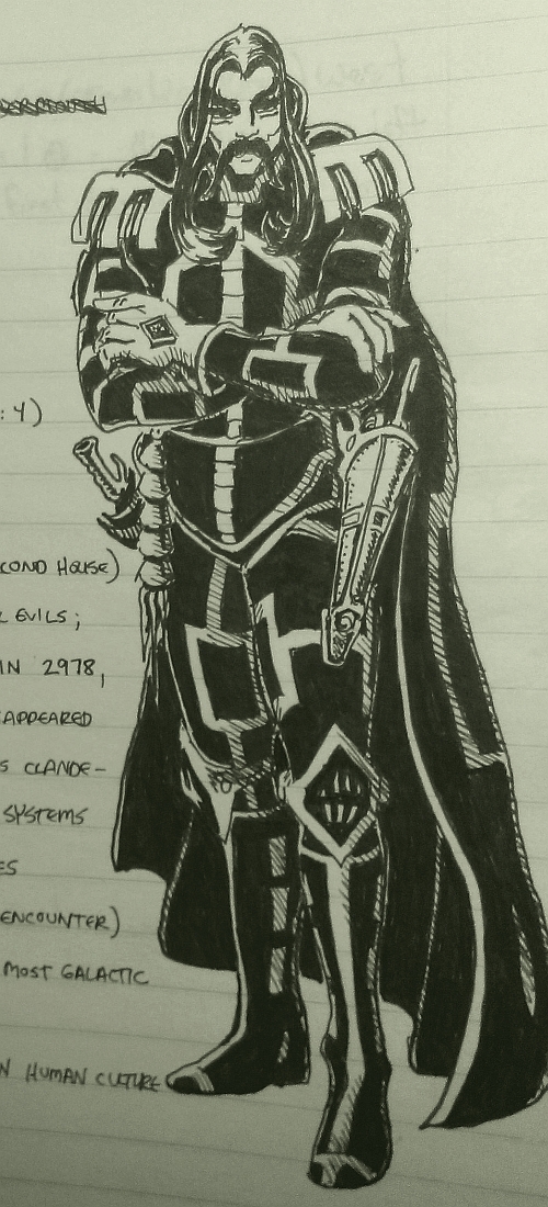 Later volumes, from the mid 1980s, feature original drafts of novels I attempted to write. Some include the first drafts of stories that eventually got published — such as "The Gray House," "Threnody," and "The Spheres Beyond Sound." There are a few almost polished drawings from my days living in Chicago, such as the character in the photo at left — some chap named Czerim Aignar, who was an original creation used in a role-playing game that several of us played on a regular basis. One notebook was a ledger from Deathrealm magazine, circa 1988. On the first page I turned to, the first name I noticed was film producer/director Frank Darabont, who was apparently a regular subscriber.