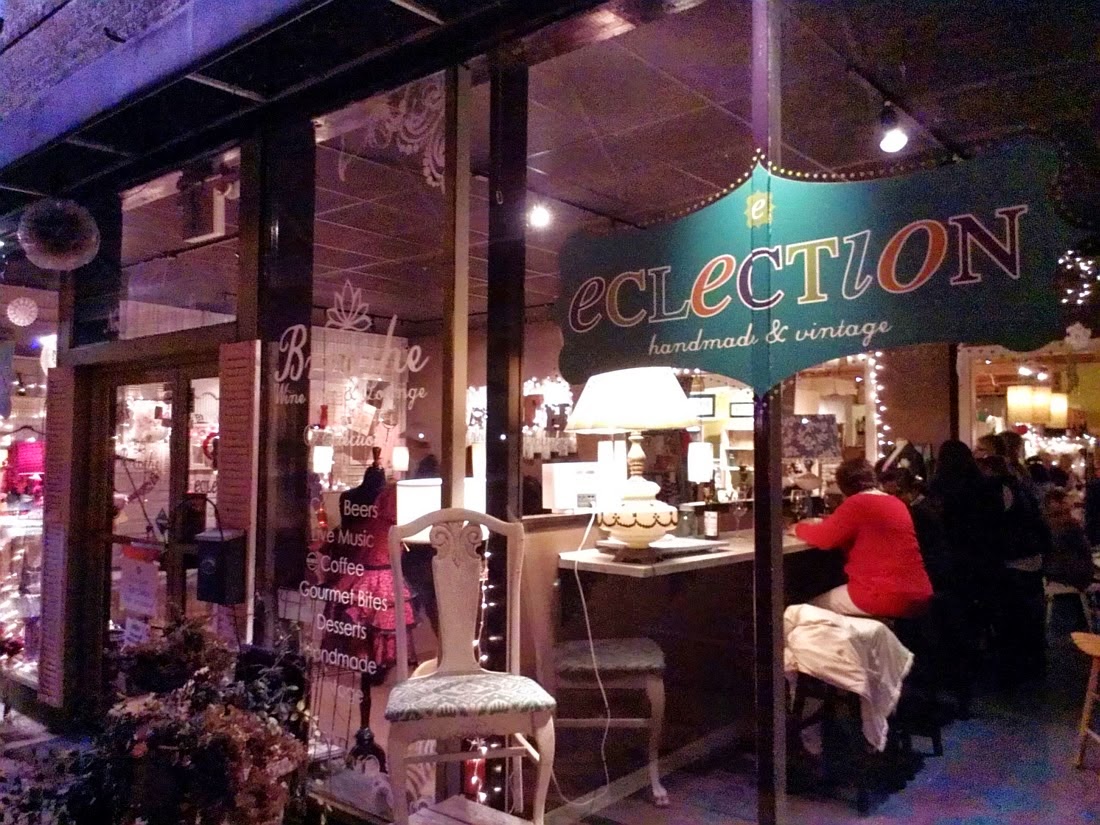 Eclection quite lives up to its name. In the refreshment department, it offers a juice, coffee, beer, and wine bar, nicely stocked, along with sweets and small plates from various local establishments. You'll also find innumerable aisles and corridors filled with antiques, crafts, artwork, jewelry, apparel, home furnishings, and more, all provided by local artisans and vendors. You can enjoy a drink at the bar, in one of several intimate alcoves, or in the main entertainment area up front. Or you can carry your glass of wine with you while wandering among the booths and cubbies filled with handmade and one-of-a-kind items that even an old curmudgeon with no general interest in such things does mightily approve.