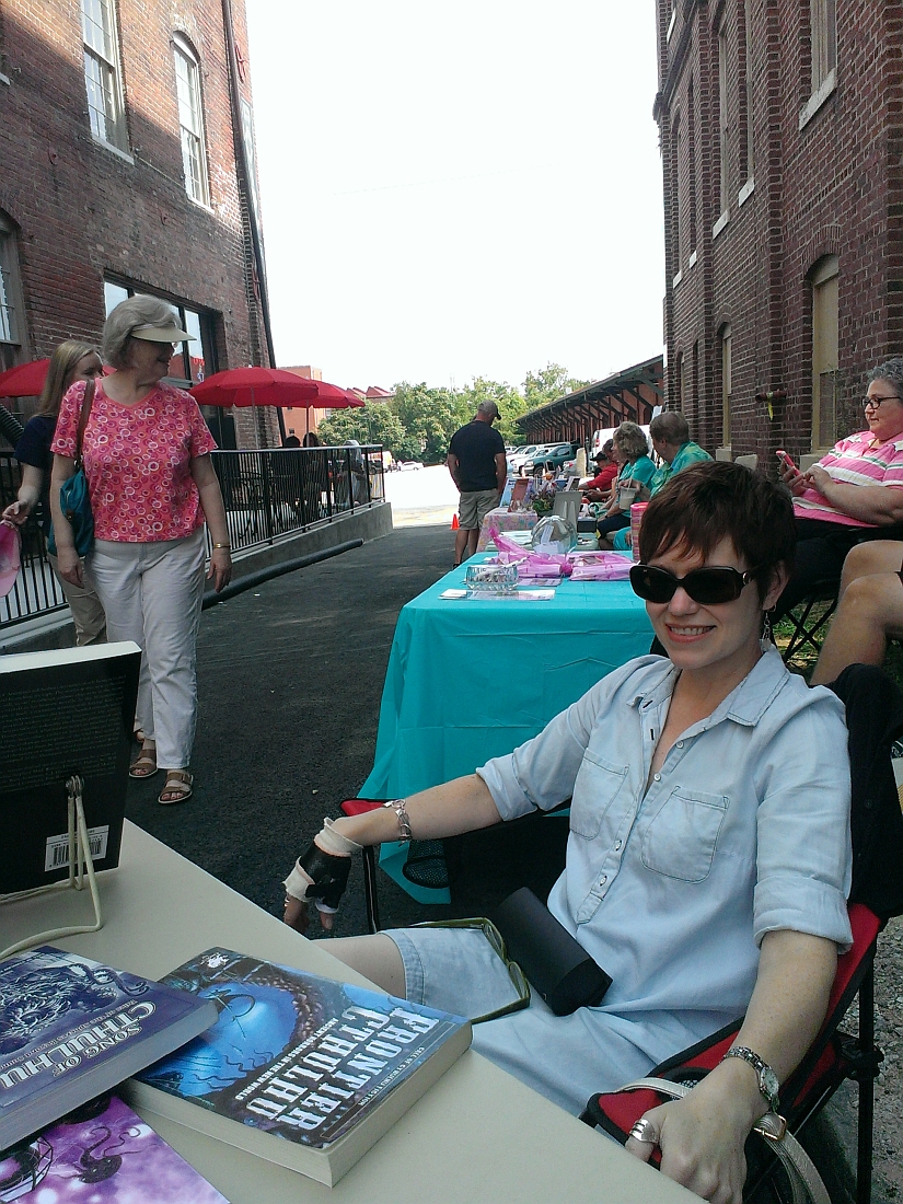 As I had posted last week, Brewed Awakening Café in Danville, VA, formerly Binding Time in Martinsville, VA, hosted its first annual book festival yesterday, continuing the tradition it had begun at its original location several years ago. I have participated in each, and while I miss having the shop in my old hometown, the owners — John and Bonnie Hale — appear to have made the right decision by relocating. Since its grand opening last week, the café-slash-bookstore has already made an indelible mark in town, generating remarkably positive publicity and drawing substantial crowds since day one. All my copies of my novels Blue Devil Island and The Monarchs sold out quickly. I kept replenishing my stock with various books lurking in my devilish bookbag, and those, too, departed post haste, all having been rightly devalued with my distinctive John Hancock.