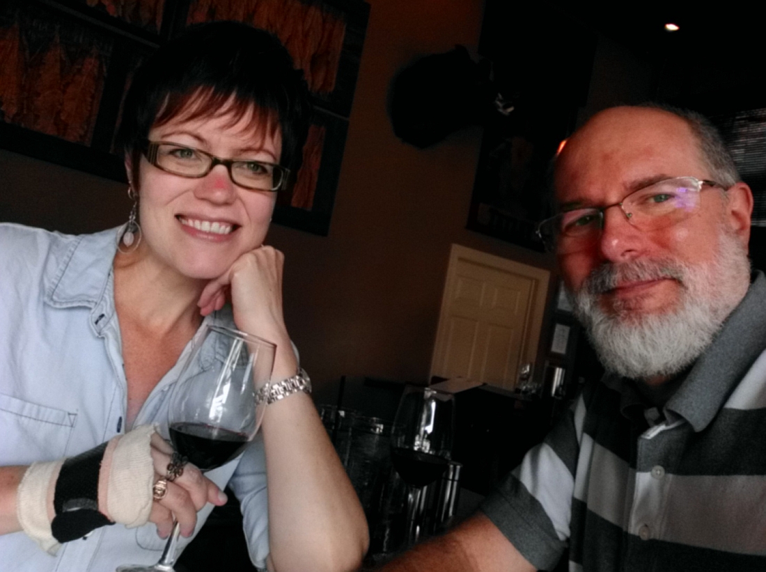 Rudolph (apparently, the sun had filtered into the alley sufficiently to scorch one's nose) and ye oldgeocaching horror writer at Golden Leaf Bistro, celebrating an excellent book festival