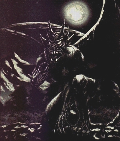 In the next scene, I was in my backyard with my younger brother (who would have been about 6 or 7 at the time) and my dad, who was grilling steaks — a frequent weekend activity in those days. Dad went into the house, and I heard something moving on the wooded hillside behind the house. Out from the trees came a dog that resembled a blue-hued greyhound — only this one was massive, about the size of a horse. Then, from behind it, strode a ten-foot-tall thing, which had the ridged, scaled body of the Creature from the Black Lagoon, colored bluish-gray, the same as the dog; the wolf-like head of the demon from Curse of the Demon ; and huge golden wings that resembled King Ghidorah's, from Ghidrah, the Three-Headed Monster . The beast looked down at me and grinned.