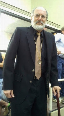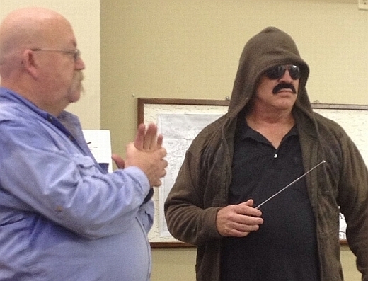 We had been sitting on the set of Invasion of the Killer Cicadas waiting for the director to call "Action!" for a while, and Ms. Sarah Smith — the director's aunt — was ready to up and exterminate some giant bugs. So she hollered, "Let's get this show on the road!" and, sure enough, before we knew it, we were in a town meeting formulating a strategy to destroy the monster insects that have invaded the little town of Martindale. Well, most of the forty or so people gathered there had that noble purpose in mind. However, one nefarious fellow — Professor Doctor Werner von Schwartztotten — was in attendance specifically to detail a rather sinister plan for world domination by way of engineering giant carnivorous insects. And lucky me — I was cast as the cranky old prof! (Good thing the producers are going against typecasting.) Happily, Ms. Brugger, who accompanied me to the shoot, was given a few lines to hurl at the camera, so I hope her day was as satisfying.