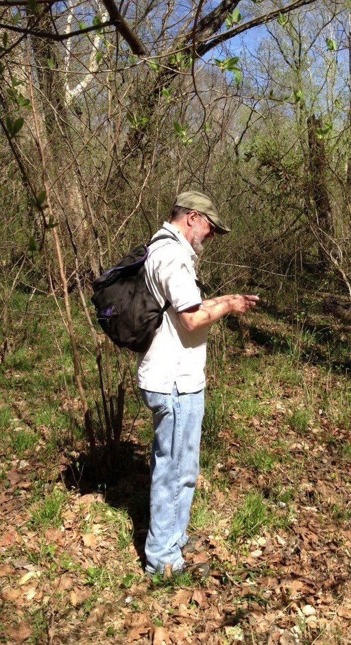 The inevitable portrait from the day's caching trip The best thing one can say about the days getting longer and the weather warming up is that it's a bit easier to fit the geocaching into the schedule. At the office, Good Friday is one of those days during the year you can take a floating holiday, and so, being as the caching was calling me and all, I took it. Spent most of it over in Alamance County, hunting for a few hides around Graham and Burlington. There's a fairly expansive natural area in north Burlington called Oakdale Town & Country Park, which runs along the always gorgeous Haw River. Much of my time out there was spent on a couple of hides that I ultimately could not find, but I did not care; it was just a great day to be outdoors. I love finding old, forgotten, and unusual things out on the trail, and there were several out that way: what might have been part of an old set of weighing scales hanging from a tree; a busted-up toy racing car stuck on a metal post; a portion of brick column in a creek that came from who-knows-what old structure. Perhaps the most interesting was discovering a new, unused can of Febreze out in the middle of woods, not too far from a cache. I figure I can always use a little extra fresh air in the house, so I took it home with me.