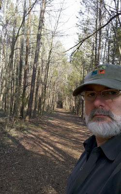 It's been a good week for first-to-finds. Got 20 last Sunday ("Cache au Vin," March 10), one on Wednesday (My First Cache Challenge, GC47FM4), and one yesterday (366 Days, GC47GX9). No first-to-finds today, but after work I did get out to Hagan Stone Park, down near Pleasant Garden, for a little caching and hiking. Not a big hike, but a pleasant one along the Ridge Trail, which is probably my favorite of the many out there. Near its beginning, the trail takes you through a tunnel of pines that extends as far as the eye can see — beautiful in any season, as you can see in the pic with the old dude to the left. And, as you may deduce from the photo above, someone in the great outdoors must have forgotten to pay their electric bill. I couldn't get that blasted bulb to turn on no matter what I did. At least I managed to sign the log. (That there is one of many fun geocaches in the park.)