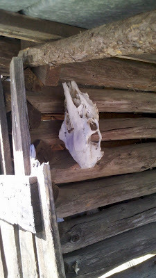 Old farmhouse overtaken by the woods. I'm pretty sure I heard unearthly voices whisperinghorrible nothings somewhere in the darkness.