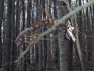 Yes, there is—or was—at least one dreaded Cacheosaurus roaming the woods around the watershed trails just north of Greensboro. The remains pictured above, taken by geocachers "Three Newsomes," apparently reside near one of my caches (Threading the Needle, GC1EQD2), just off on the Reedy Fork Trail. The Newsomes were understandably taken aback, as are most people who find themselves face-to-face with a dreaded Cacheosaurus, whether it's dead or alive. At least they had the presence of mind to take a photo, and they were lucky enough for it not to be the last photo they ever took.For of course, where there are dead dreaded Cacheosauruses, there are always live dreaded Cacheosauruses in close proximity, and this photo clearly shows that these are the remains of a baby dreaded Cacheosaurus. So be advised. If you're hiking out that way, be sure and take a llama with you, for llamas are the only things dreaded Cacheosauruses like to eat more than geocachers and other hapless hikers.