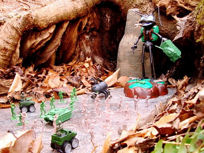 It's a multi-stage geocache — "X-tream Evil," that is (GC1AM8X). I won't be giving away any secrets by revealing that, in order to reach one of the cache stages, you have to construct a rope bridge over a ravine, which — out of necessity — makes the whole business a team effort. Our team consisted of folks with monikers like 3EaglesHigh, DLF2001, RobGSO, and Damned Rodan; we were also accompanied by the cache owner his own self, Mr. Rich "Night-Ranger" Colter, who made sure things got fixed after we broke them (or in one case, broke a stage so that it would actually work). We hit the woods at 8:00 AM, and got the quickest, easiest stages done promptly. No problems at all until we actually constructed the rope bridge across the rocky ravine. On the first test, the lower support line suffered a catastrophic failure — due to faulty equipment — which would have been bad news indeed had someone actually been out on the line. But that's why God made cache owners. In a fairly short time, he provided us with the new, necessary item to make reparations, and soon enough, a secure "Postman's Walk" spanned the ravine.Uncle Rob went across first and procured the item that needed procuring in order to continue. Next, the two young eaglets went across, making it look shockingly easy. But then came the old dude's turn, and I gotta tell you, my crossing was far less graceful than the young 'uns who preceded me. Now the bridge isn't terribly high, though it's far enough up that, if you fall into the ravine, it's going to be an unpleasant experience. Fortunately, I remain just agile enough to maintain some semblance of balance. I reached the far side without mishap, and the rest of the team soon followed. From there, we set out for the final stages of the cache, only to find ourselves bamboozled when...lo and behold...a stage turned out to be missing.