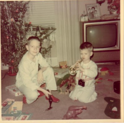 A typical Christmas: Dude with gun and brother blowing his bugle In elementary school, Phred developed a special affinity for music. I taught him to play guitar, and it wasn’t long before his proficiency surpassed mine. He also played clarinet in the school concert and marching bands, so people started calling him “Pete Fountain.” Over the years, he learned to play other instruments, including bass guitar, keyboards, and drums.