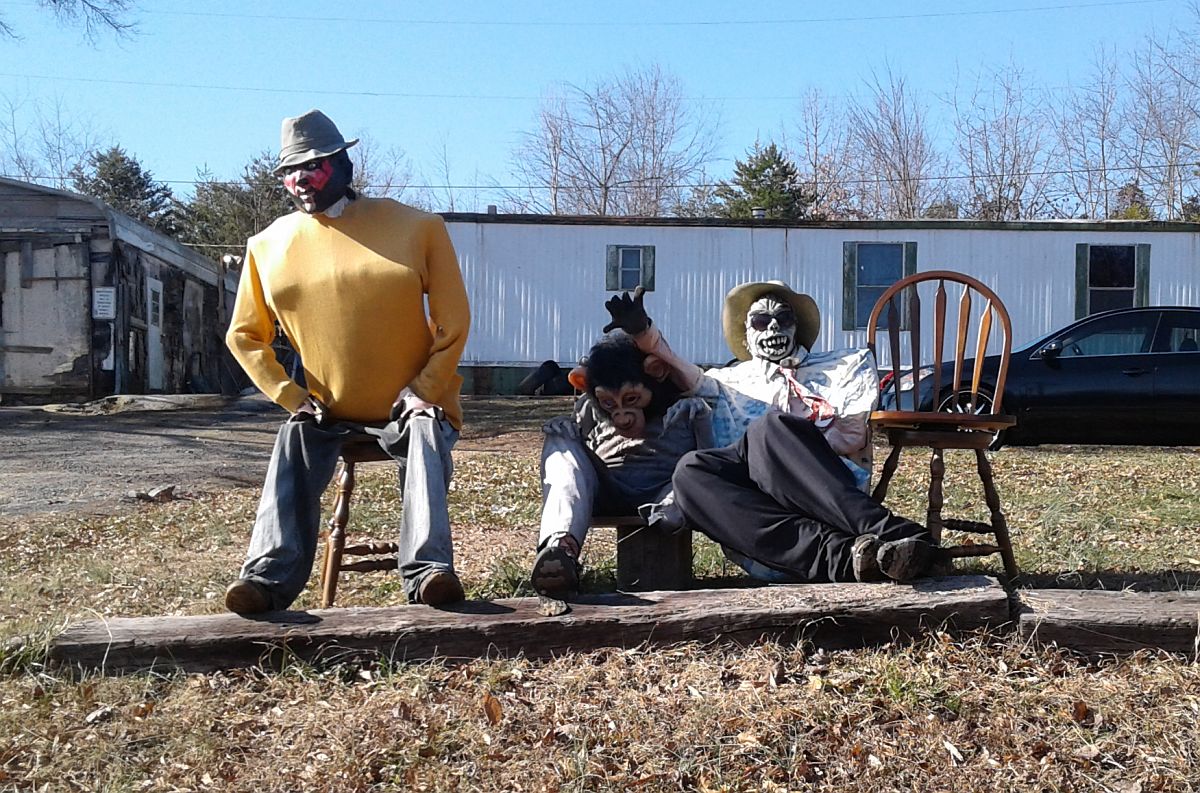 I first noticed him back in 2015, standing all by his lonesome, one arm raised in cheerful greeting. Occasionally, he would boast a new wardrobe. Eventually, he even made himself a friend: a cute little devil-horned fellow for whom the Creep appeared to display considerable affection. After a time, a huge, bearded, ghoulish-looking chap joined the pair. A frizzy, chapeau-crowned ape man followed shortly afterward (which was actually our devil-horned friend wearing a mask; he wasn't fooling anyone, you know). Soon, the lot of them began showing off various hats, regularly changing poses and clothes. For me, traveling the Old Axton Road through Sandy Level between Martinsville and Greensboro became something of a treat.