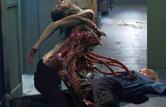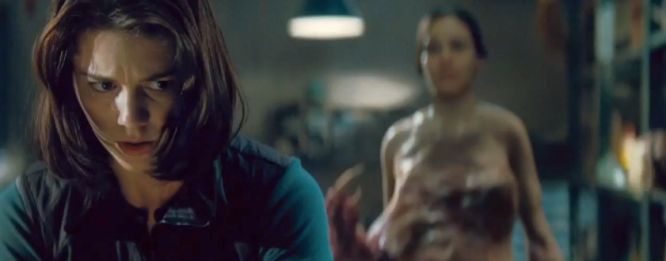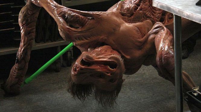 Much of the criticism I'm aware of centers on the CGI effects, often called outright "bad." As one who tends to not be a CGI aficionado, I absolutely disagree on this. While no effects in the film come near the technical brilliance achieved by SPFX masters Rob Bottin and Stan Winston in Carpenter's film, the CGI effects, far from being "bad," are generally beautifully executed. The creature designs reflect the shifting, insect-like character from Carpenter's movie while adding new physical permutations, such as the centipede-like "hand monster." At times, the critters move at lightning speed, which to me only increases the sense of panic. Those designs that need to be consistent with Carpenter's original, such as the "split-face" beast (whose origin I find absolutely horrifying) are visually consistent. But one of the film's most striking images comes when the horror inside the ice is first revealed—a shadowy suggestion of a spindly, insect-like form with clearly defined claws.