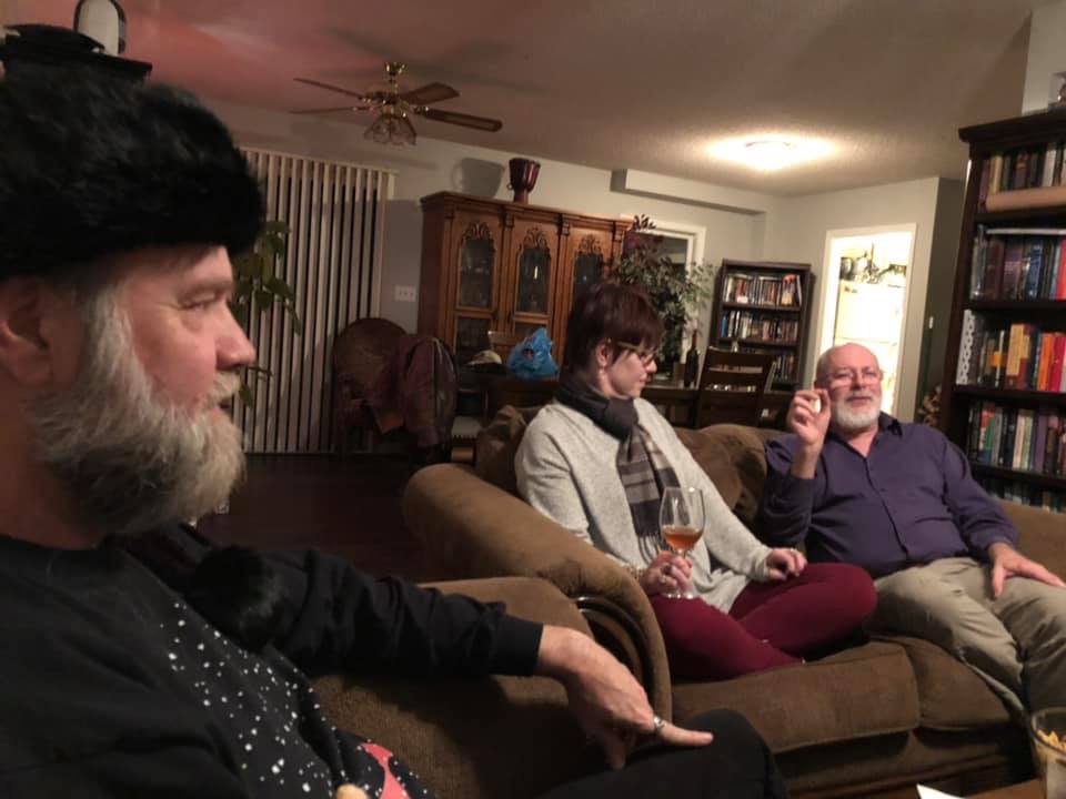 That event was a visit with authors Stephen and Samaire Provost, whom I've known via social media for quite some time and who recently—quite coincidentally—moved not only to Martinsville but to my old neighborhood. They live, as the crow flies, about 500 feet from our place. Of course, in Martinsville, you don't get anywhere as the crow flies, so we set out on foot and hoofed it a half mile or so up the street. This little gathering turned out to be the highlight of the holiday for me. Ms. B. and I got there at 7:45 p.m. and didn't end up leaving till after 1:00 a.m. For this, we can blame stimulating conversation, first-rate spirits, and some incredible vittles Samaire put together (I ate more than my fill, but I feel a little bad there was still quite a bit left after we all finished). When we left their place, it had gotten quite a bit colder than when we had arrived. In fact, a sheen of frost now blanketed the neighborhood. Our little jog back to Mom's through the still, silent night, with Christmas lights still burning all around us, proved to be at least as enjoyable as anything else we did yesterday.